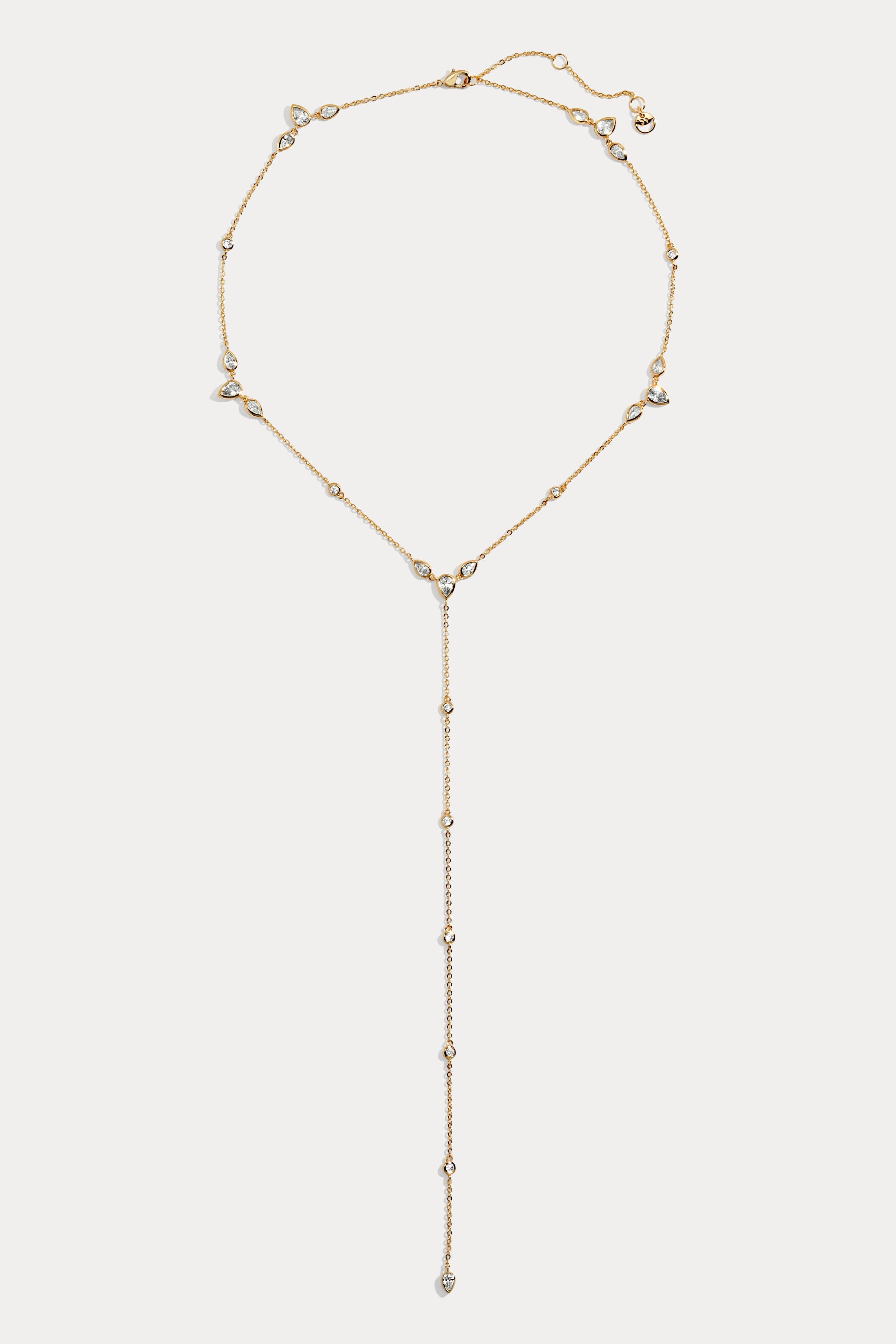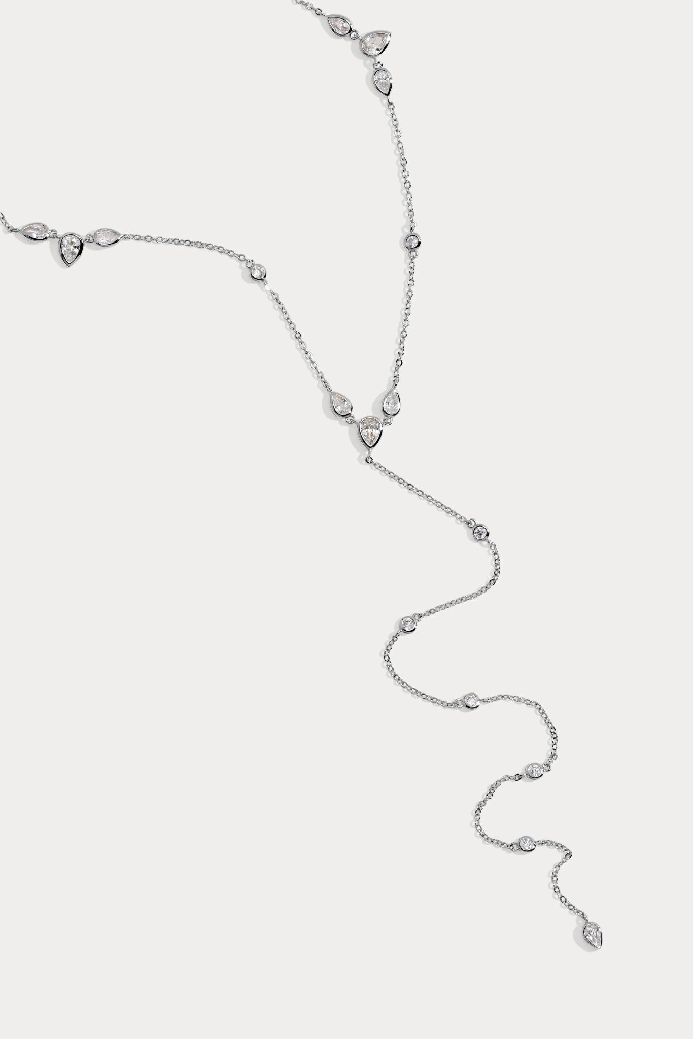 14kt gold plated brass OR Rhodium Plated Brass Stones are White Cz, and measure 2.5mm - 6.0mm each Necklace measures 16" with jump rings at 17" and 18" for an extended wear Drop measures 7.5" Lobster clasp fastening