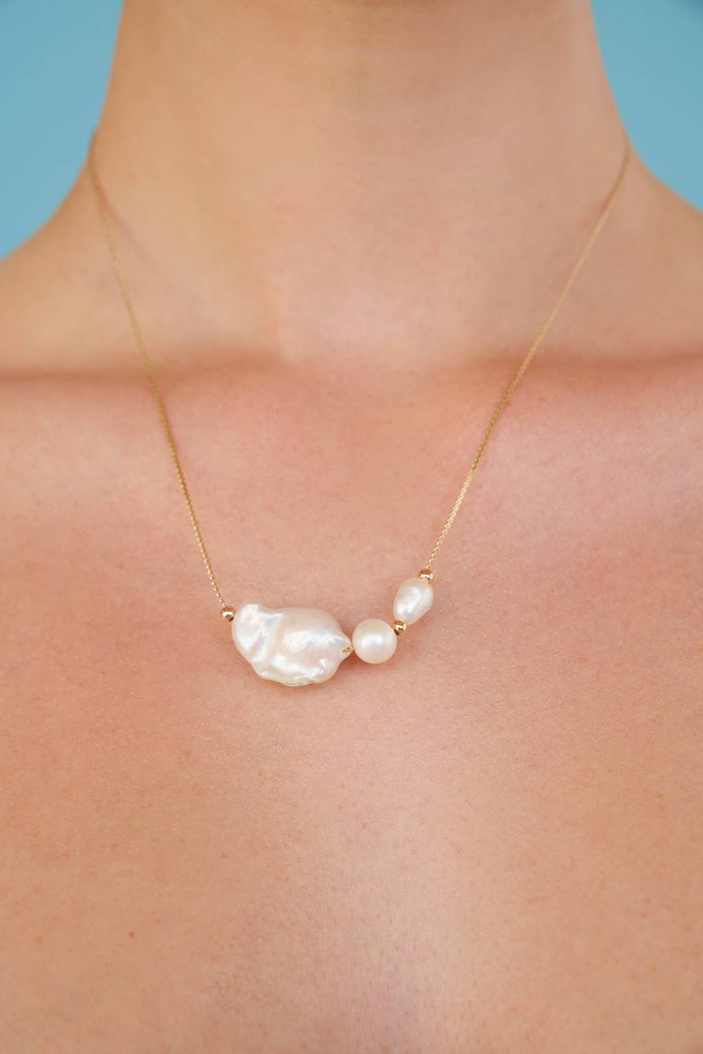 A serpentine chain embellished with a trio of pearls. Available in 14kt gold plated brass Chain width measures