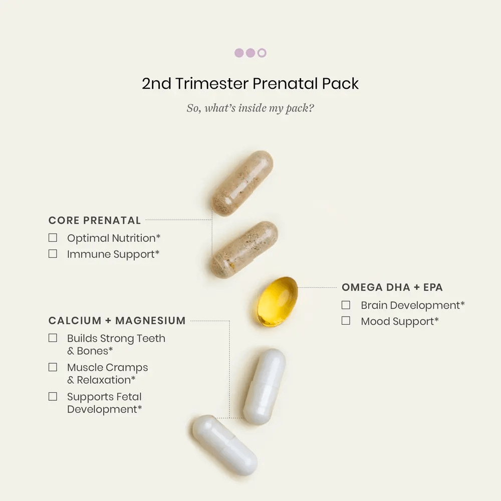 A complete daily prenatal vitamin routine for your 2nd trimester, designed by a team of leading OB/GYNs to support baby’s skeletal growth while easing muscle cramps.* Each daily pack includes a full-spectrum prenatal vitamin, omega DHA + EPA and additional calcium and magnesium, in no nausea formulations.