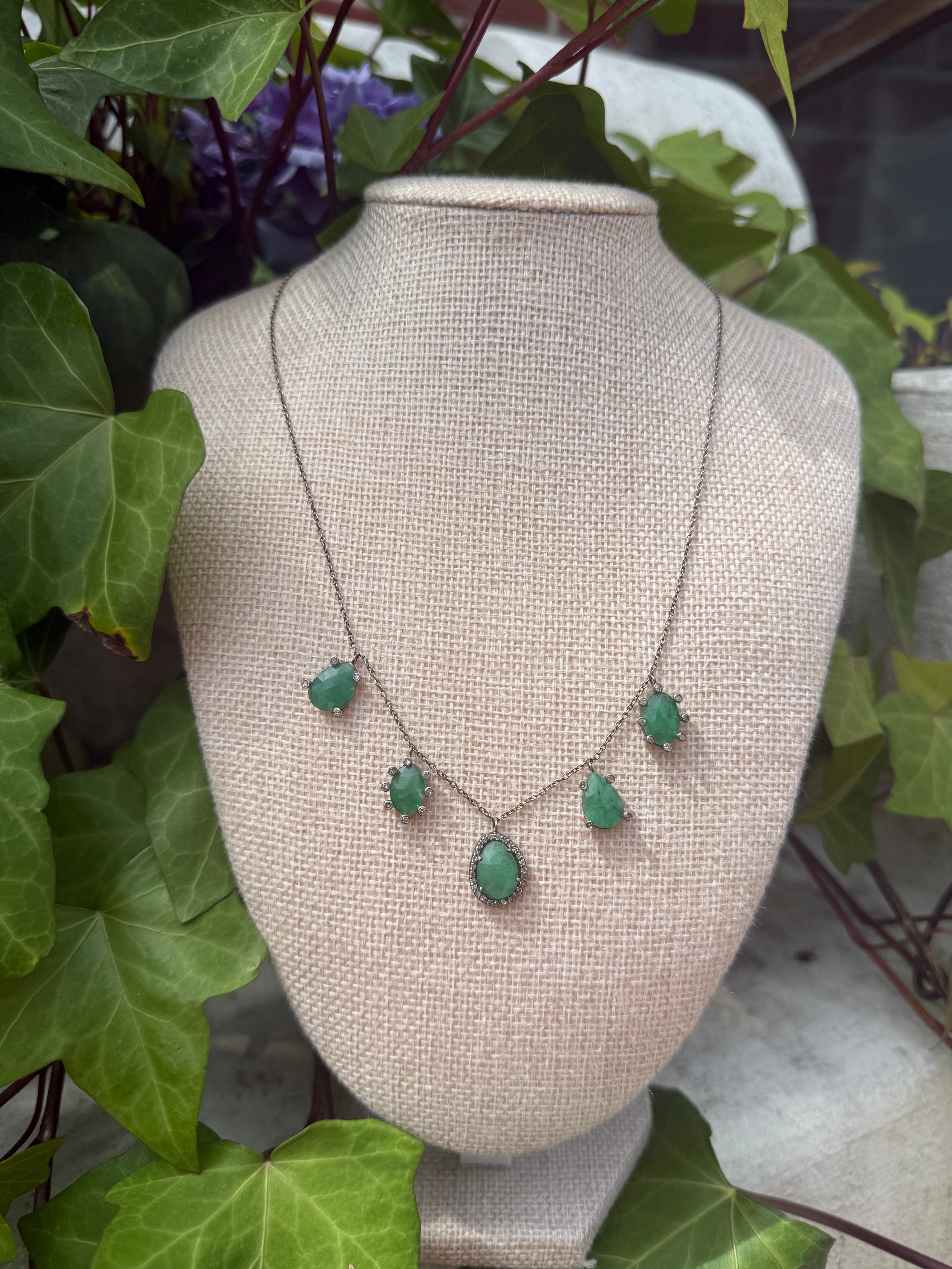 5 emerald drops necklace with black diamonds set in oxidized sterling silver.