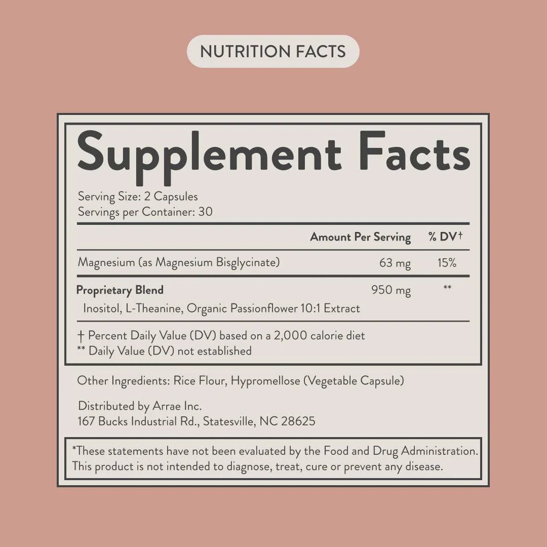 Magnesium (as Magnesium Biglycinate), Inositol, L-Theanine, Organic Passionflower 10:1 Extract, Rice Flour, Vegetable Capsule