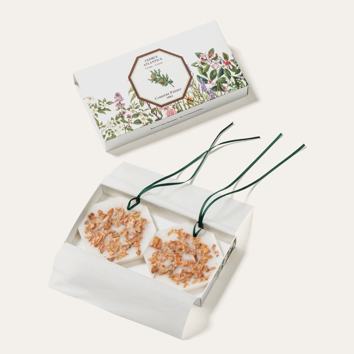 The botanical palets box contains two palets of the same fragrance. Practical, they are designed to perfume small spaces, like a wardrobe or a drawer. Thanks to their ribbon, they can also be hanged on a door handle or a coat hanger.