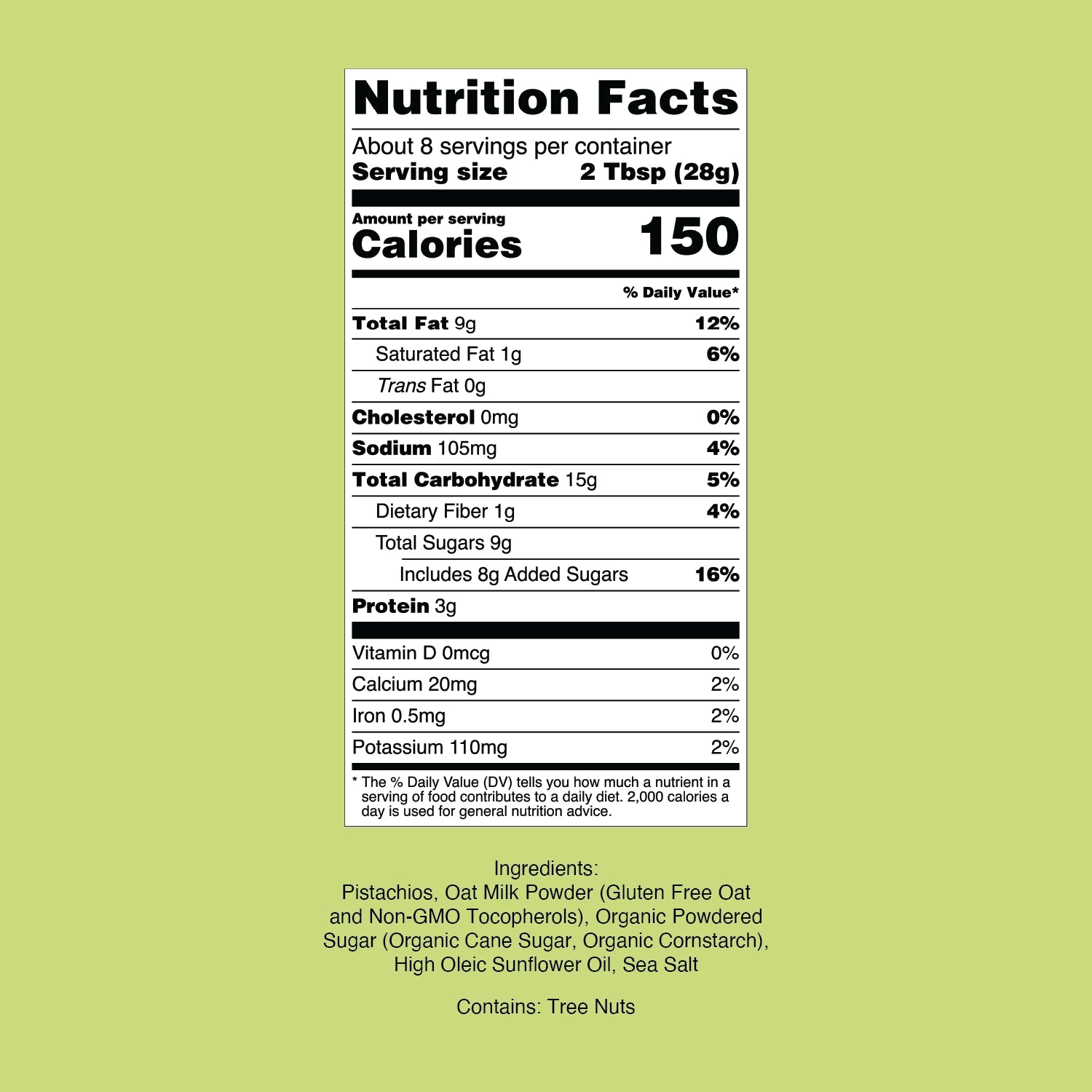 Made in small batches with real pistachios. never any artificial flavors, 100% vegan, gluten-free & non-GMO.