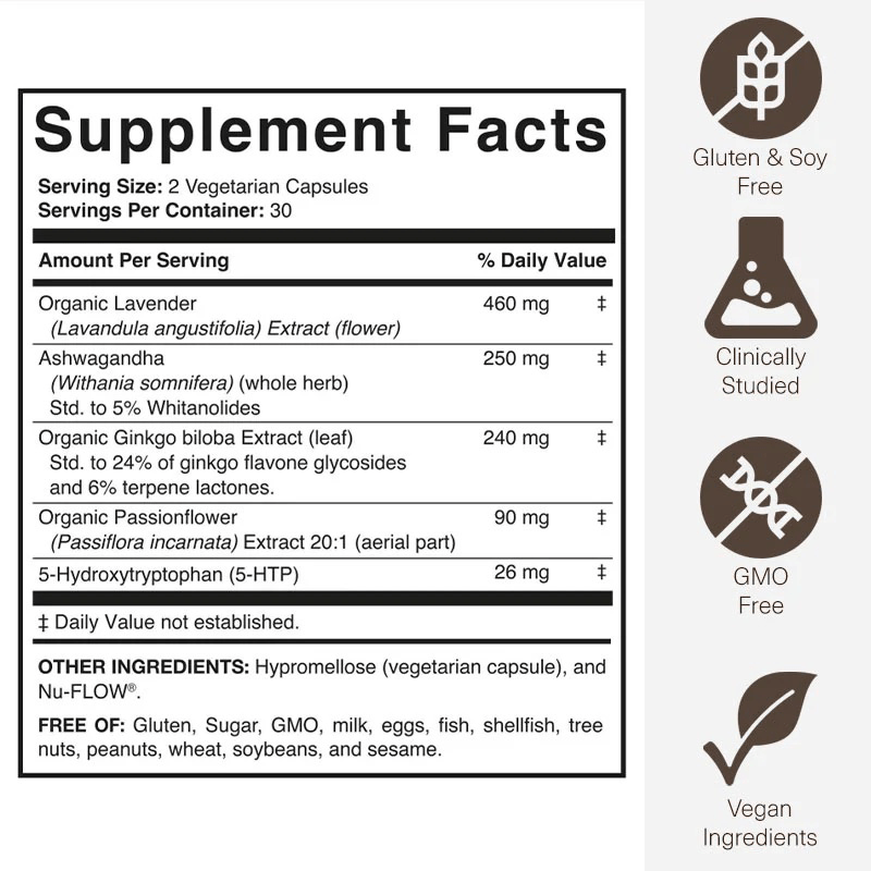 Passionflower, organically grown and non-GMO, naturally calms the nervous system, easing anxiety while maintaining mental alertness, so you can feel both relaxed and focused.