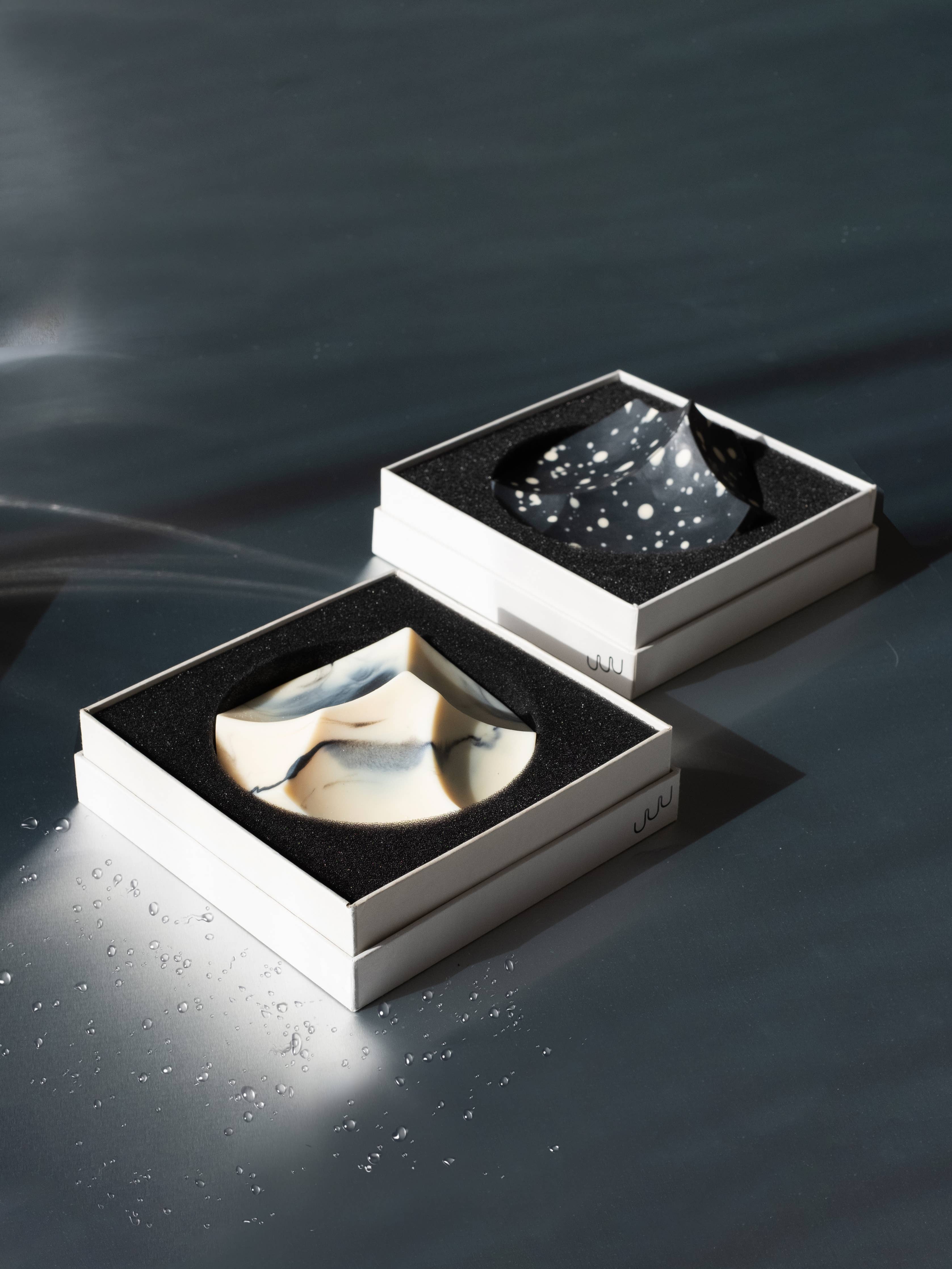 To use: Brush wet hands or cloth over the soap's surfaces to create lather, release the aromatic essential oils, and reveal the changing slopes