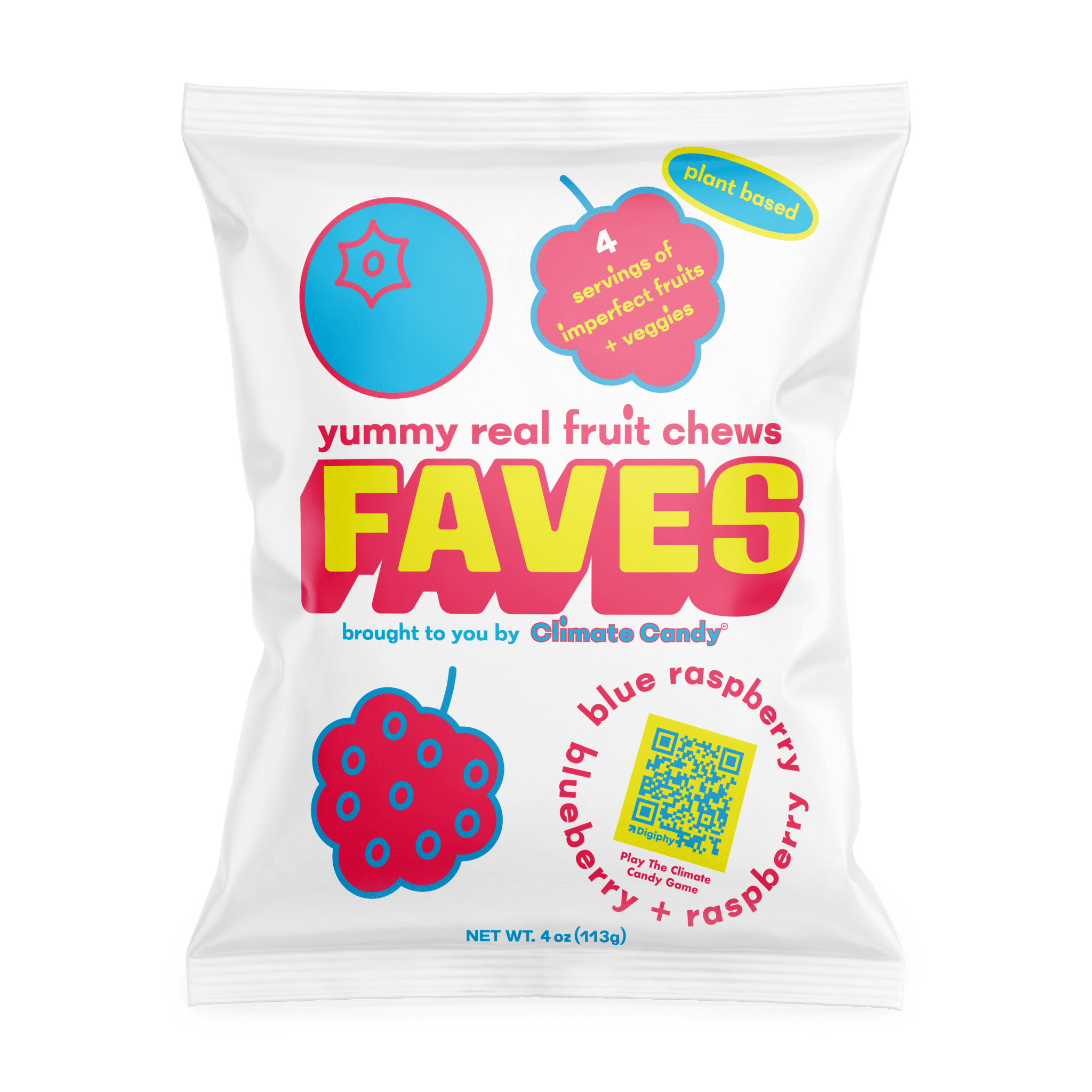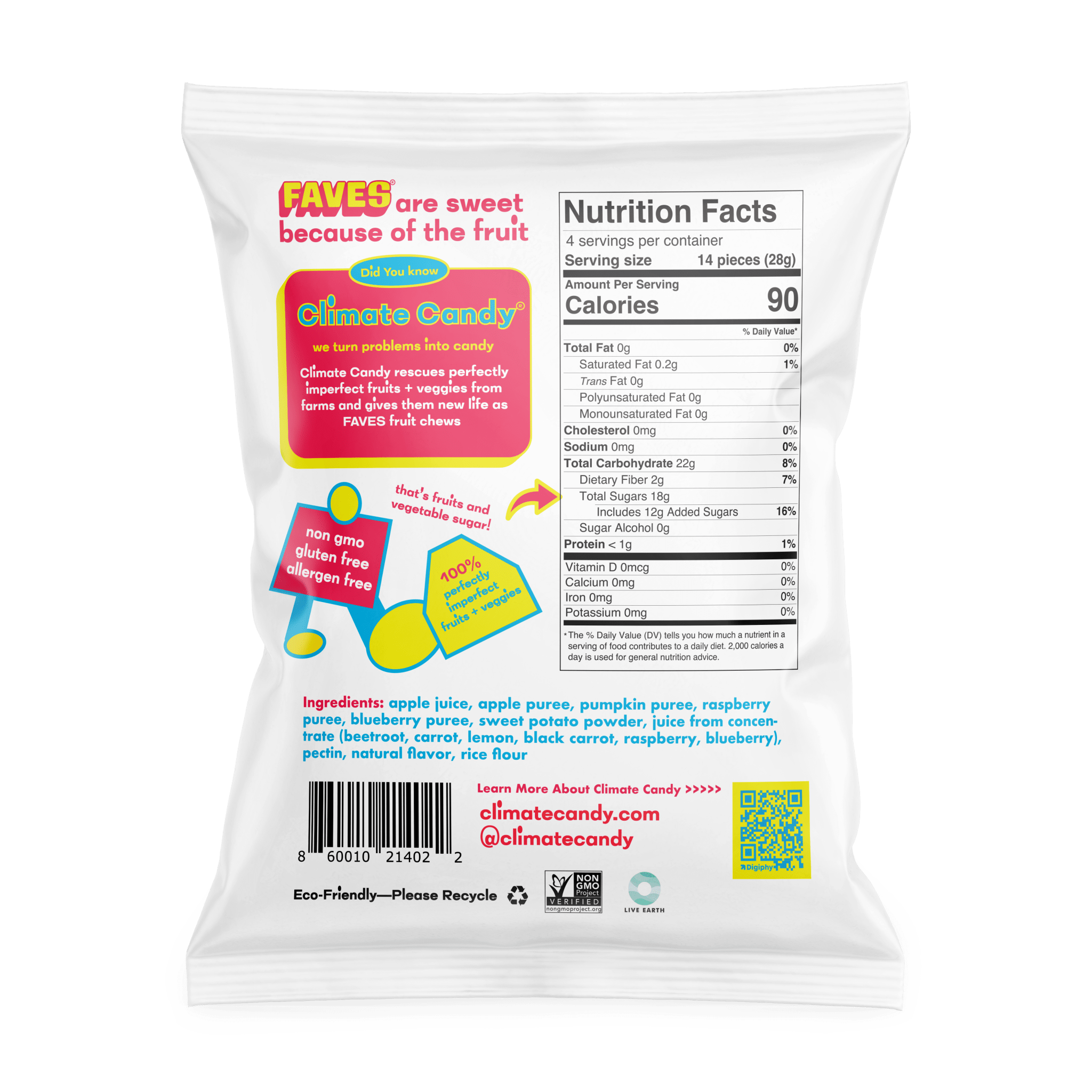 Climate Candy rescues perfectly imperfect fruits and vegetables from farms and gives them new life as FAVES fruit chews. FAVES candy is stealth nutrition by providing 4 servings of fruits and vegetables in every 4 oz pack.