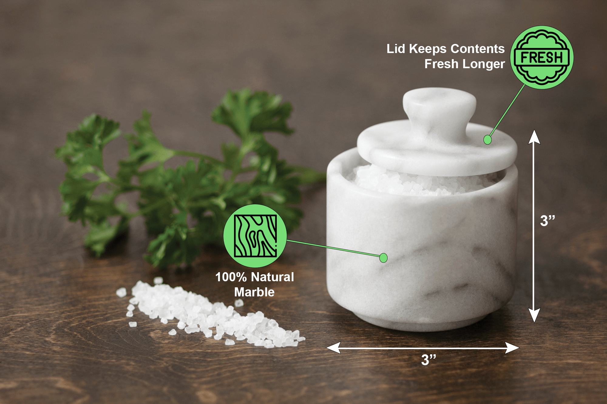 100% MARBLE CONSTRUCTION has unique non-stick properties that make this cellar the perfect container for not only salt, but for herbs, spices, sugar, and more!