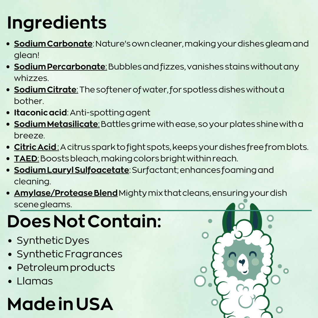 - Make the switch to Green Llama and enjoy an eco-friendly, green, and sustainable dishwashing experience. Perfect for those seeking non-toxic, biodegradable, and effective cleaning solutions.