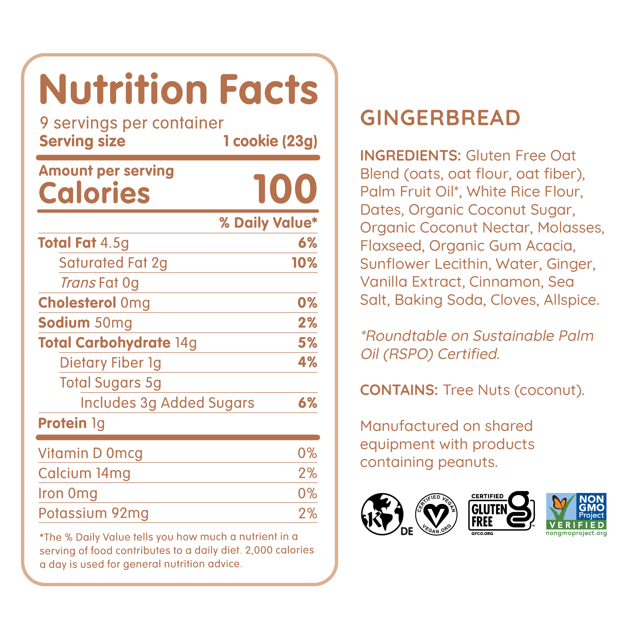 Gluten Free Oat Blend (oats, oat flour, oat fiber), Palm Fruit Oil*, White Rice Flour, Dates, Organic Coconut Sugar, Organic Coconut Nectar, Molasses, Flaxseed, Organic Gum Acacia, Sunflower Lecithin, Water, Ginger, Vanilla Extract, Cinnamon, Sea Salt, Baking Soda, Cloves, Allspice. *Roundtable on Sustainable Palm Oil (RSPO) Certified.