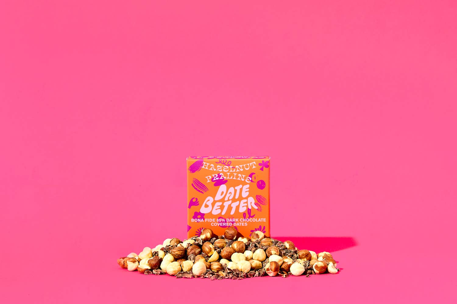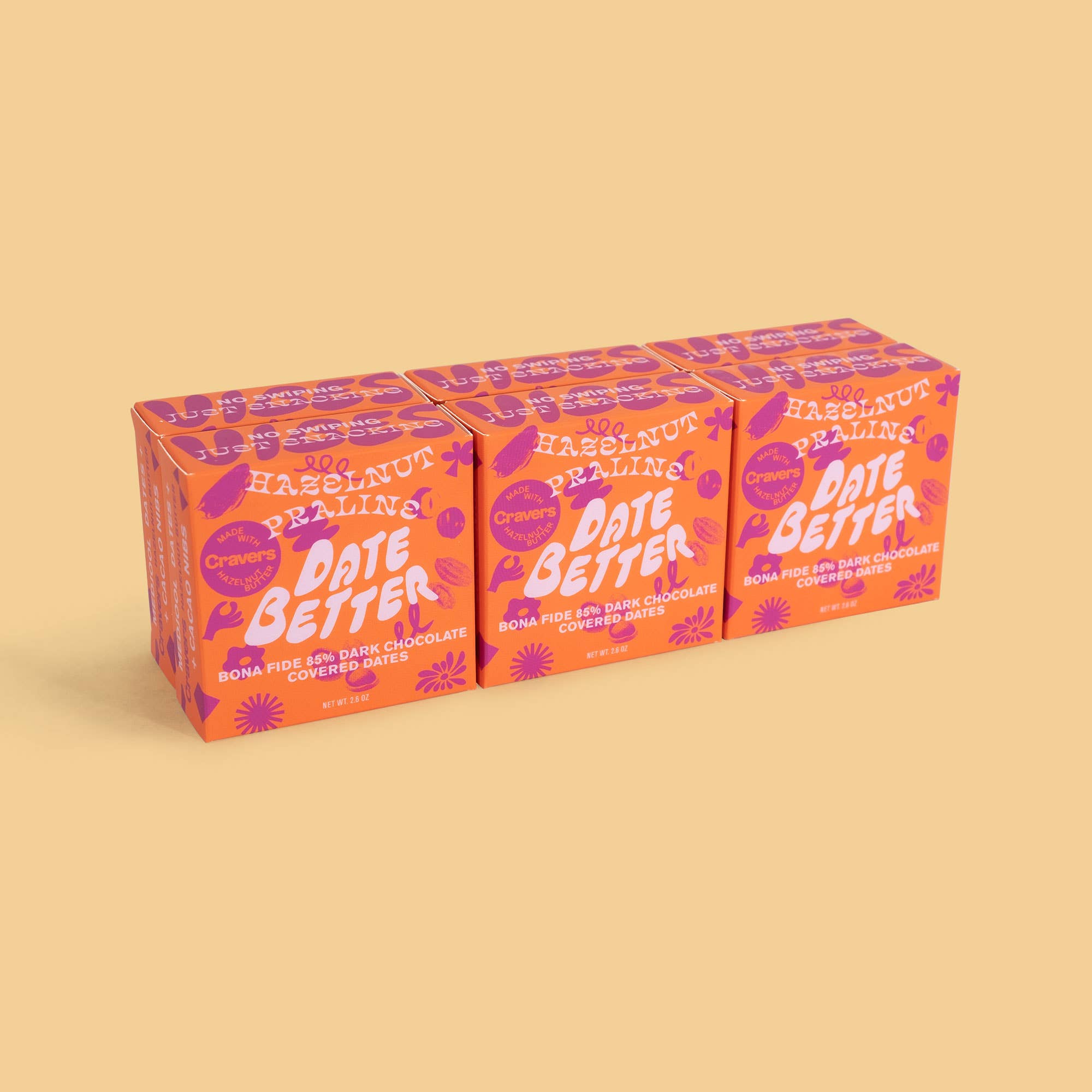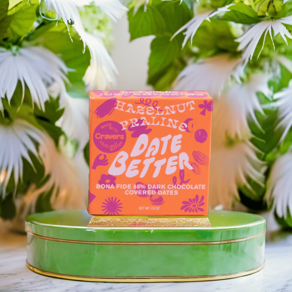 Chewy Medjool dates are stuffed with creamy hazelnut filling speckled with crunchy cacao nibs. These dates are enrobed in organic, fair trade 85% dark chocolate that is free from any soy or emulsifiers. This is the healthy candy alternative that really delivers.
