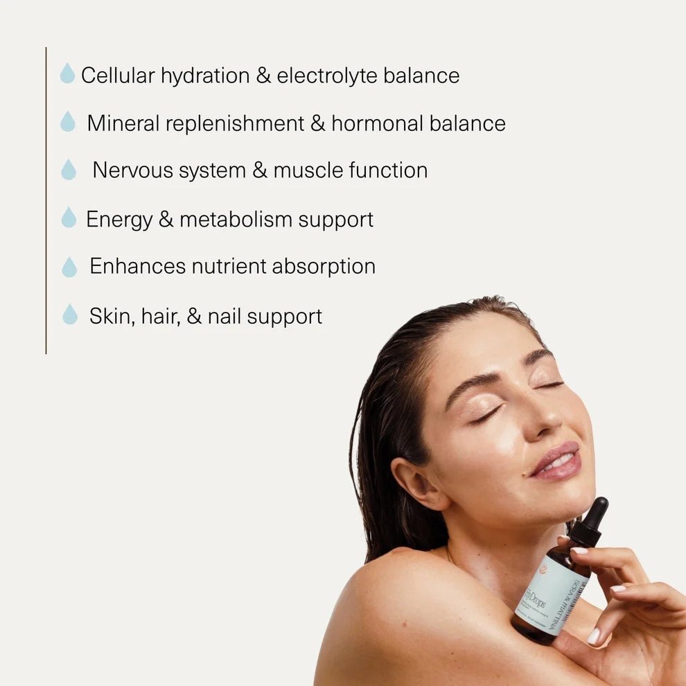 Sera & Mattina Hydrops contain full-spectrum ionic minerals sourced from concentrated inland seawater, providing a rich and balanced blend of essential nutrients. It delivers vital electrolytes such as magnesium, chloride, sodium, and potassium to support hydration and overall wellness. In addition, it offers trace minerals including boron, zinc, selenium, and manganese, which are crucial for maintaining a wide range of bodily functions.