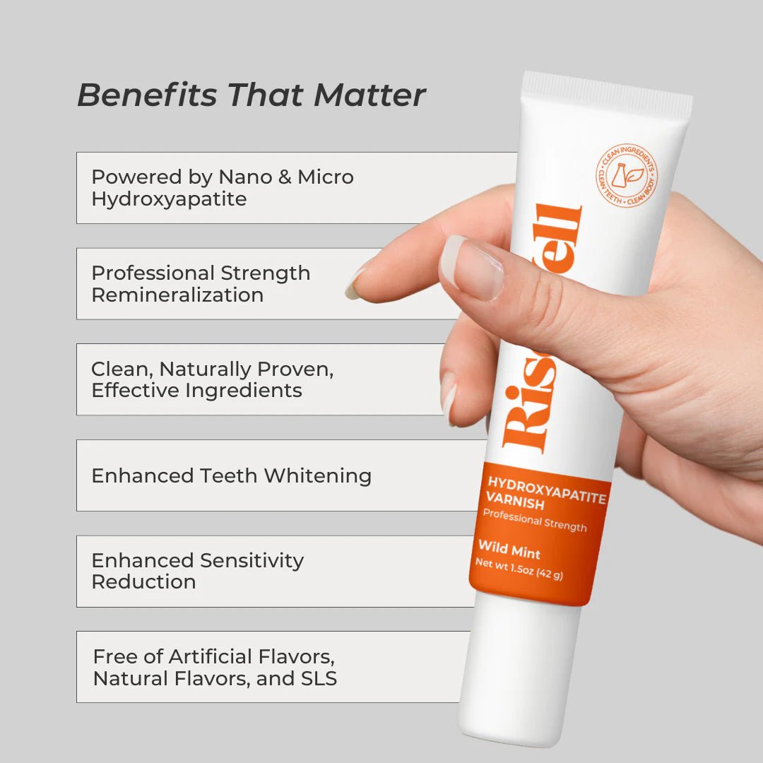 Deliver advanced enamel protection with RiseWell’s professional-strength Hydroxyapatite Varnish. Designed for in-office or at-home use, this fluoride-free formula remineralizes, whitens, and reduces sensitivity without toxins. Safe for all ages and ideal for patients seeking a clean, biomimetic alternative to fluoride varnish.