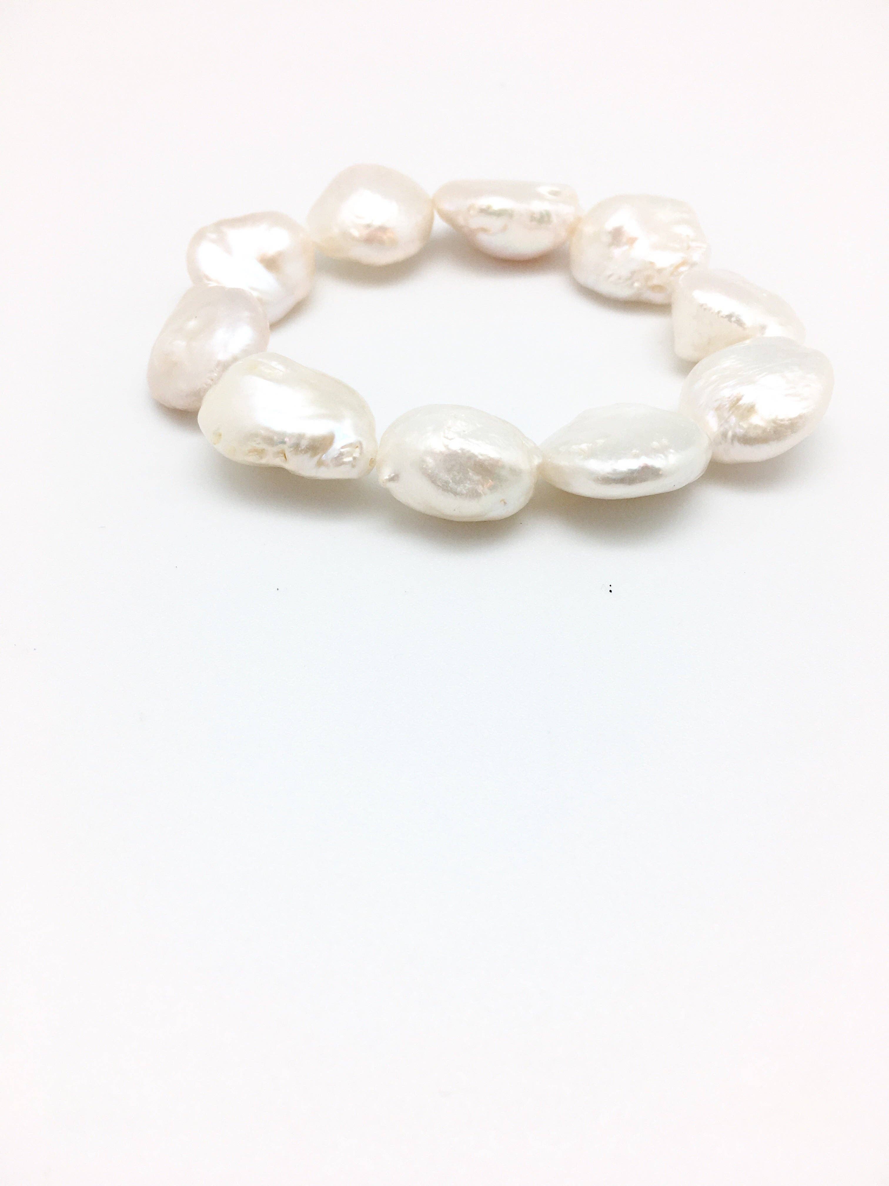 Oversized white coin pearl bracelet on sturdy elastic. Approximately 7” in diameter.