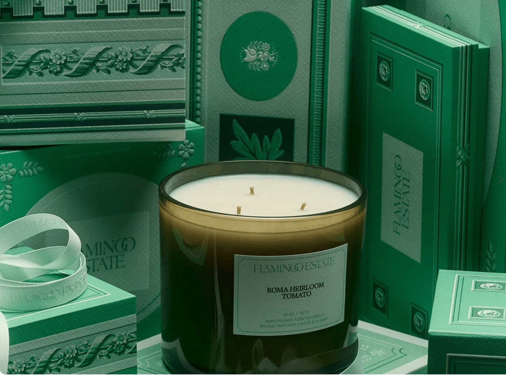 The most famous Flamingo Estate product has more than tripled in size. The result is a universe of Tomato - herbaceous, supple, and green- now in an oversized hand-blown glass vessel, triple-wicked, and ready to burn for weeks.