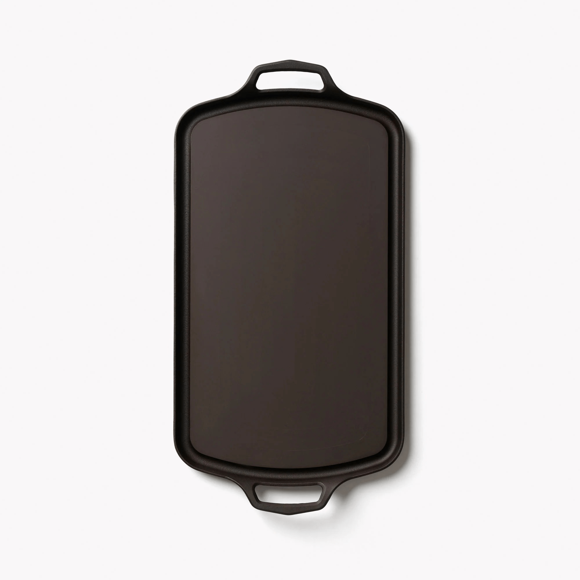 The Long Cast Iron Griddle is our vintage-style double-burner griddle. A precisely-machined 9 x 16 ½-inch cooking surface covers two stovetop burners, making room for large batches of pancakes, french toast, bacon or burgers, and creating an extended searing surface for ambitious holiday roasts.