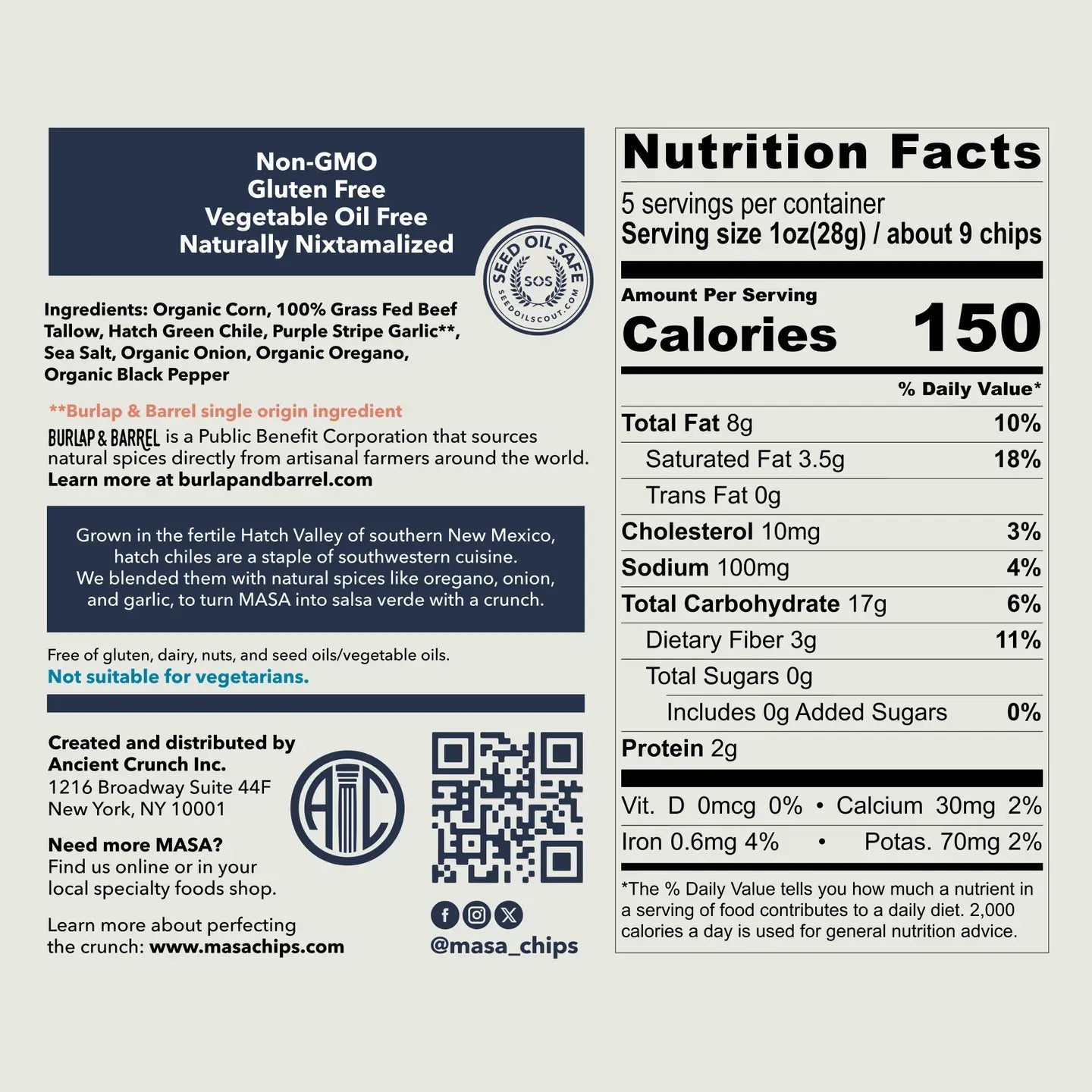 Organic Corn, 100% Grass-Fed Beef Tallow, Hatch Green Chile, Purple Stripe Garlic**, Sea Salt, Organic Onion, Organic Oregano, Organic Black Pepper