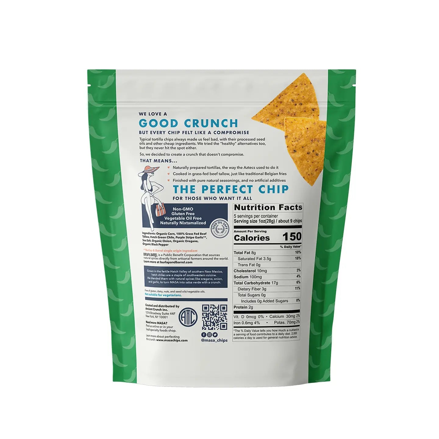 Grown in the fertile Hatch Valley of southern New Mexico, Hatch green chiles are a legendary staple of Southwestern cuisine, packed with just the right amount of heat. Paired with bold, real ingredients like purple stripe garlic, onion, and oregano to create a chip that tastes like salsa verde with a satisfying crunch. Made with heirloom corn and fried in 100% grass-fed beef tallow, this seed oil-free chip brings the depth of New Mexican flavor to every bite.