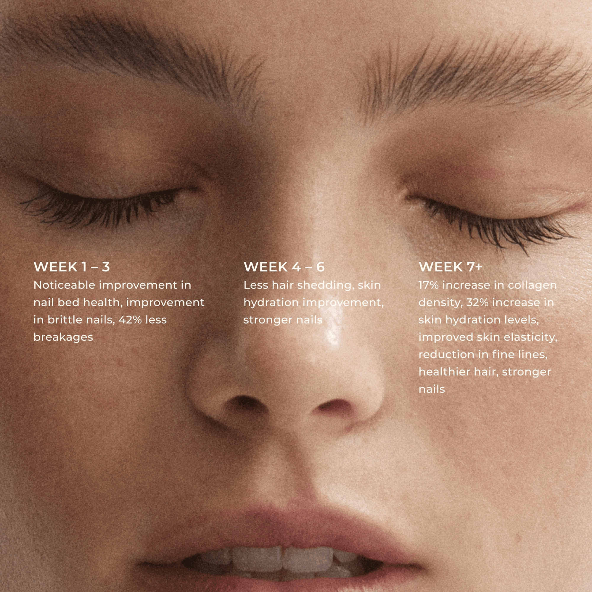 Developed to seamlessly integrate into your everyday beauty routine to improve skin elasticity and firmness, reduce fine lines, strengthen nails and support new hair growth.