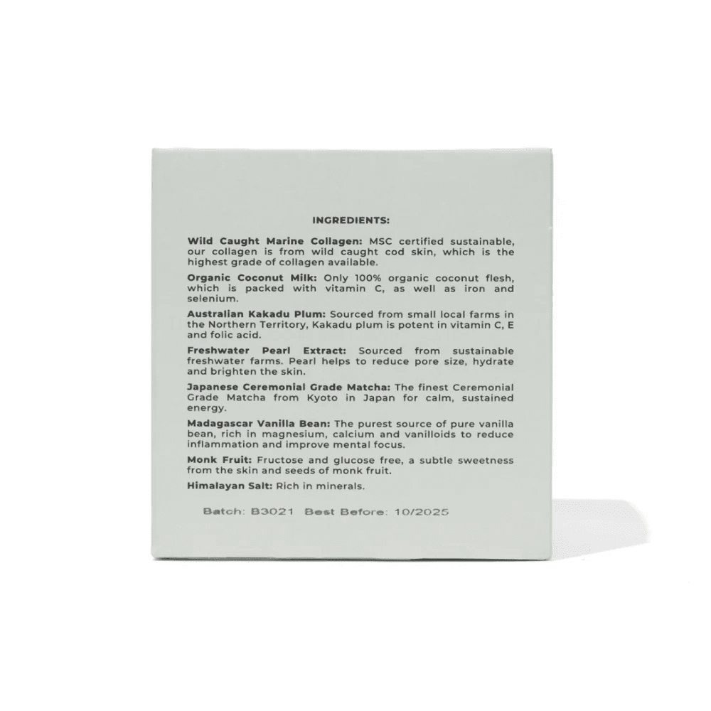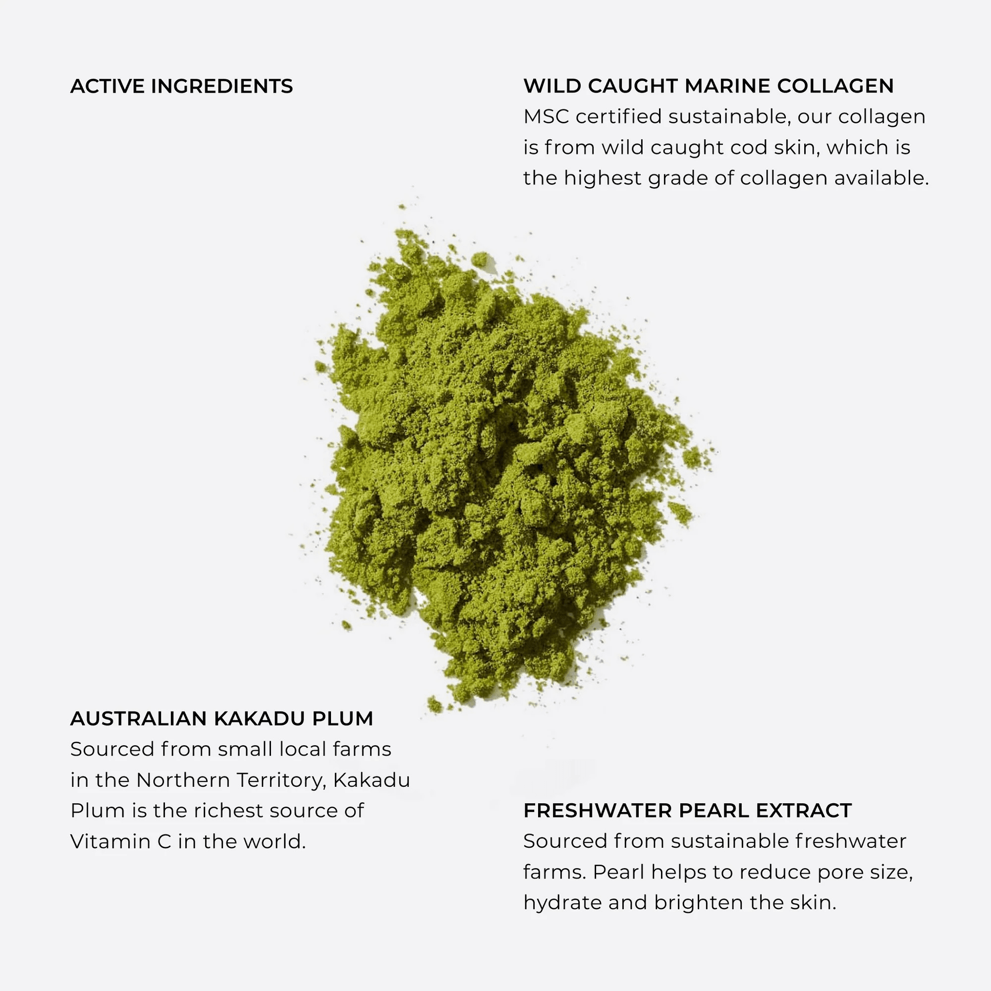PEARL Marine Collagen Superpowder (Ceremonial Grade Matcha) is a potent beautifying formulation of wild-caught Norwegian marine collagen, freshwater pearl powder, organic native Australian Kakadu plum & Ceremonial Grade Japanese Matcha.