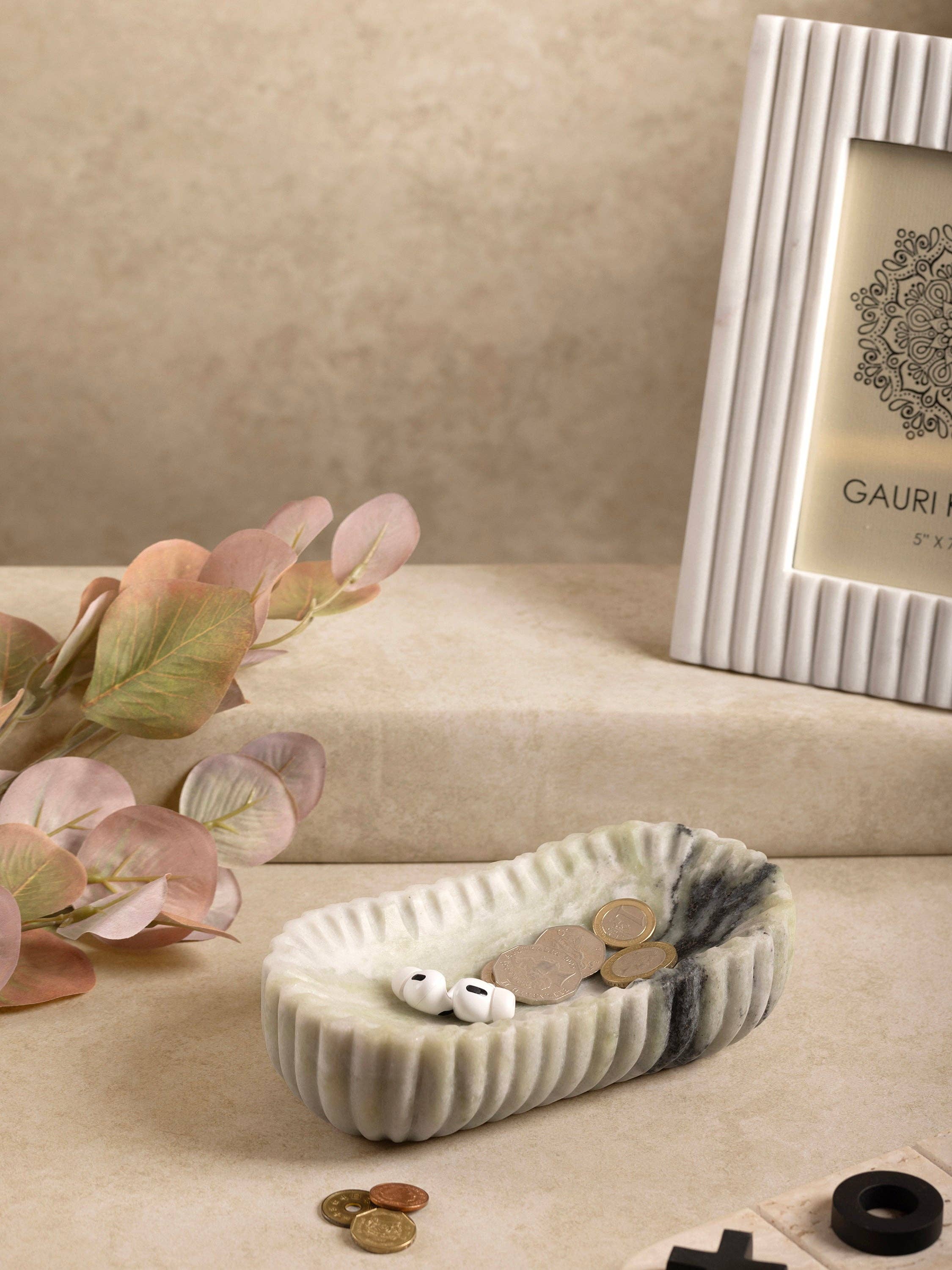 The Naos Fluted Green Onyx Catch-All, with its bold green hues and finely sculpted fluted grooves, is carved from a single block of stone, showcasing its unique thickness and refined elegance. Crafted in India, this decorative bowl embodies the time-honored craftsmanship of skilled artisans who meticulously shape raw stone into a masterpiece.