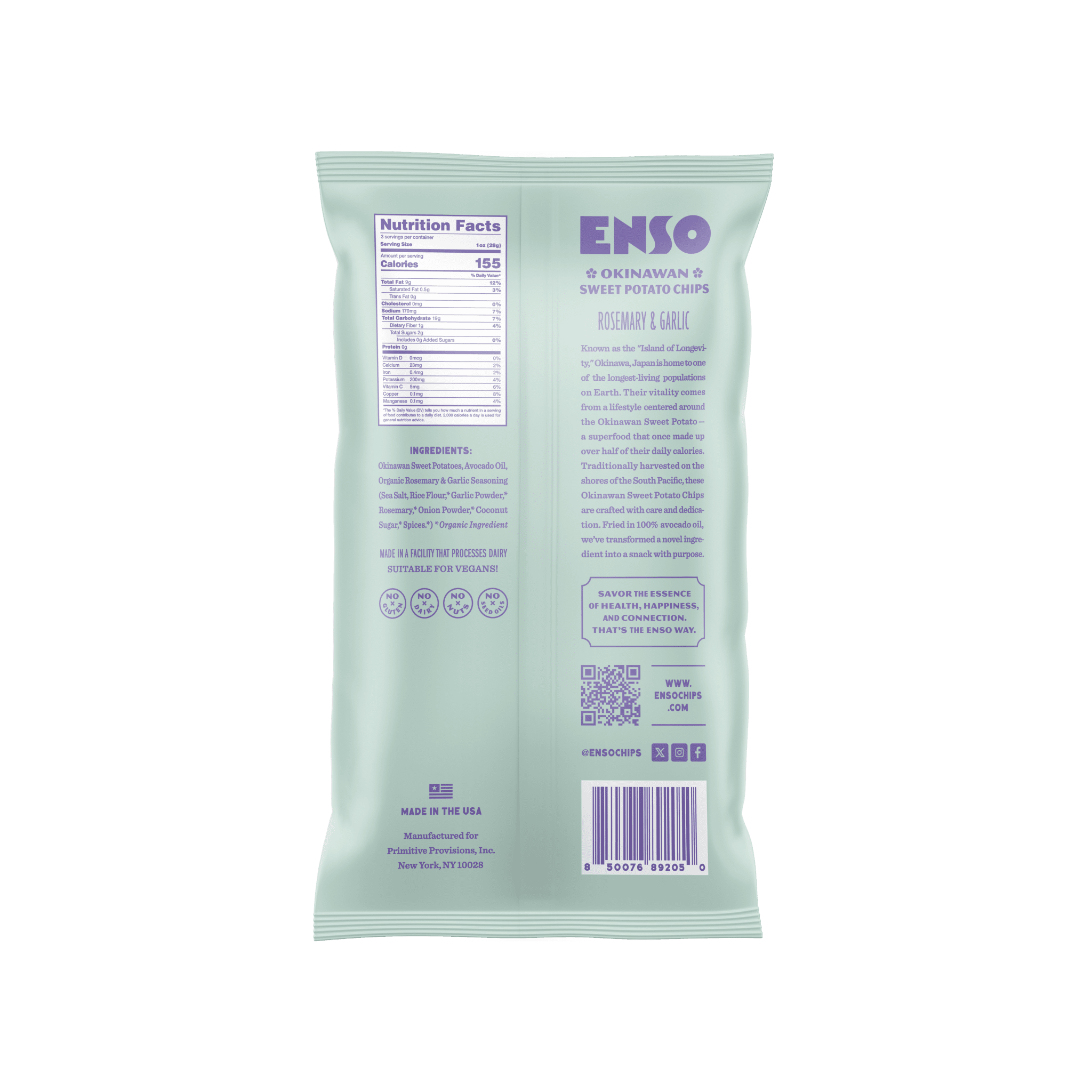 Known as the 'Island of Longevity,' Okinawa, Japan is home to one of the longest-living populations on Earth. Their vitality comes from a lifestyle centered around the Okinawan Sweet Potato—a superfood that once made up over half of their daily calories. Harvested on the shores of the South Pacific, these Okinawan sweet potato chips are crafted with care and dedication. Fried in 100% avocado oil, we've transformed a novel ingredient into a snack with purpose.