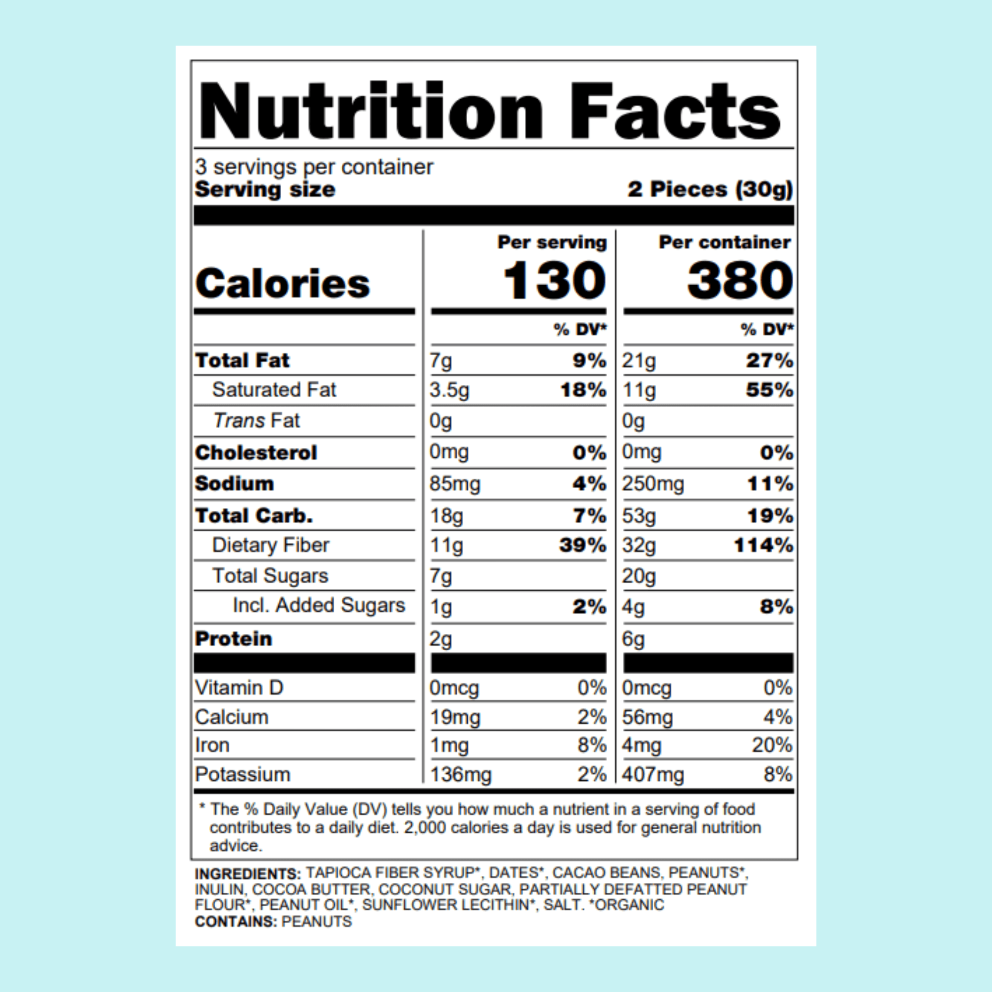 Tapioca fiber syrup, dates, cacao beans, peanuts, inulin, cocoa butter, coconut sugar, partially defatted peanut flour, peanut oil, sunflower lecithin, salt. Contains Peanuts.