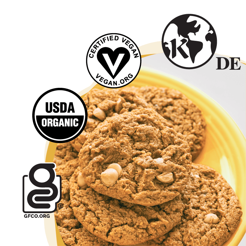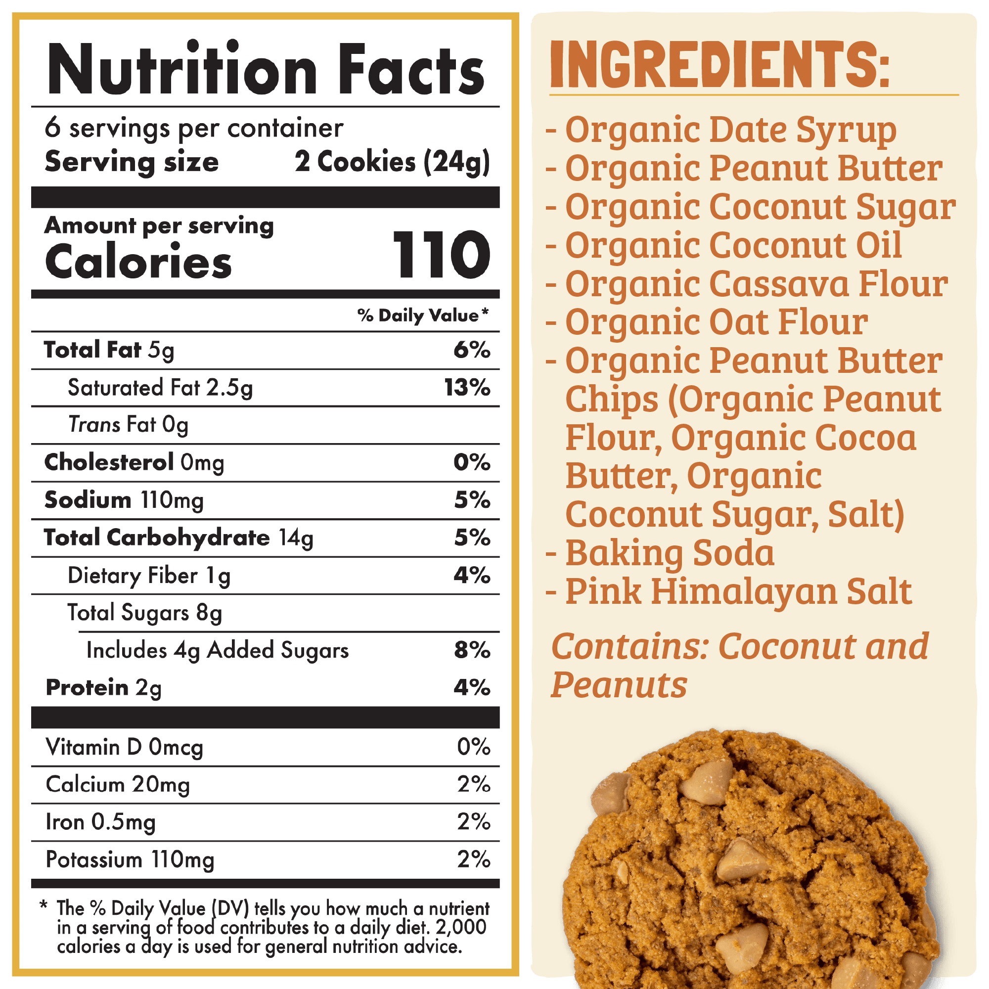 INGREDIENTS: Organic Date Syrup, Organic Peanut Butter, Organic Coconut Sugar, Organic Coconut Oil, Organic Cassava Flour, Organic Oat Flour, Organic Peanut Butter Chips (Organic Peanut Flour, Organic Cocoa Butter, Organic Coconut Sugar, Salt), Baking Soda, Pink Himalayan Salt.