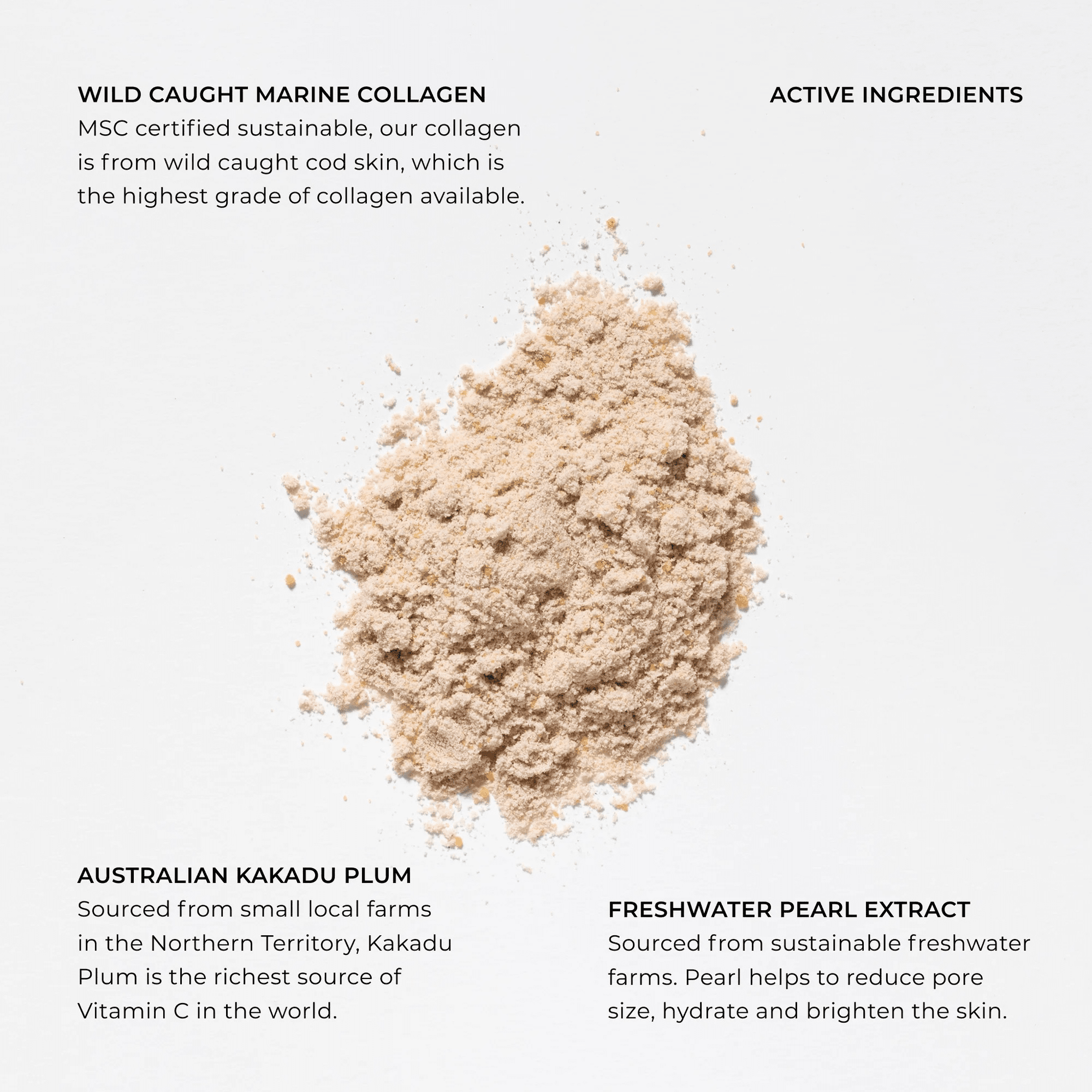 - Formulated with wild-caught marine collagen, antioxidant-rich Kakadu plum, and mineral rich freshwater pearl powder, it supports skin firmness, nail strength, and hair vitality — supporting skin, hair and nail longevity from within.Â