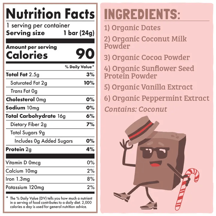 Organic Dates, Organic Coconut Milk Powder, Organic Cocoa Powder, Organic Sunflower Seed Protein Powder, Organic Vanilla Extract, Organic Peppermint Extract.