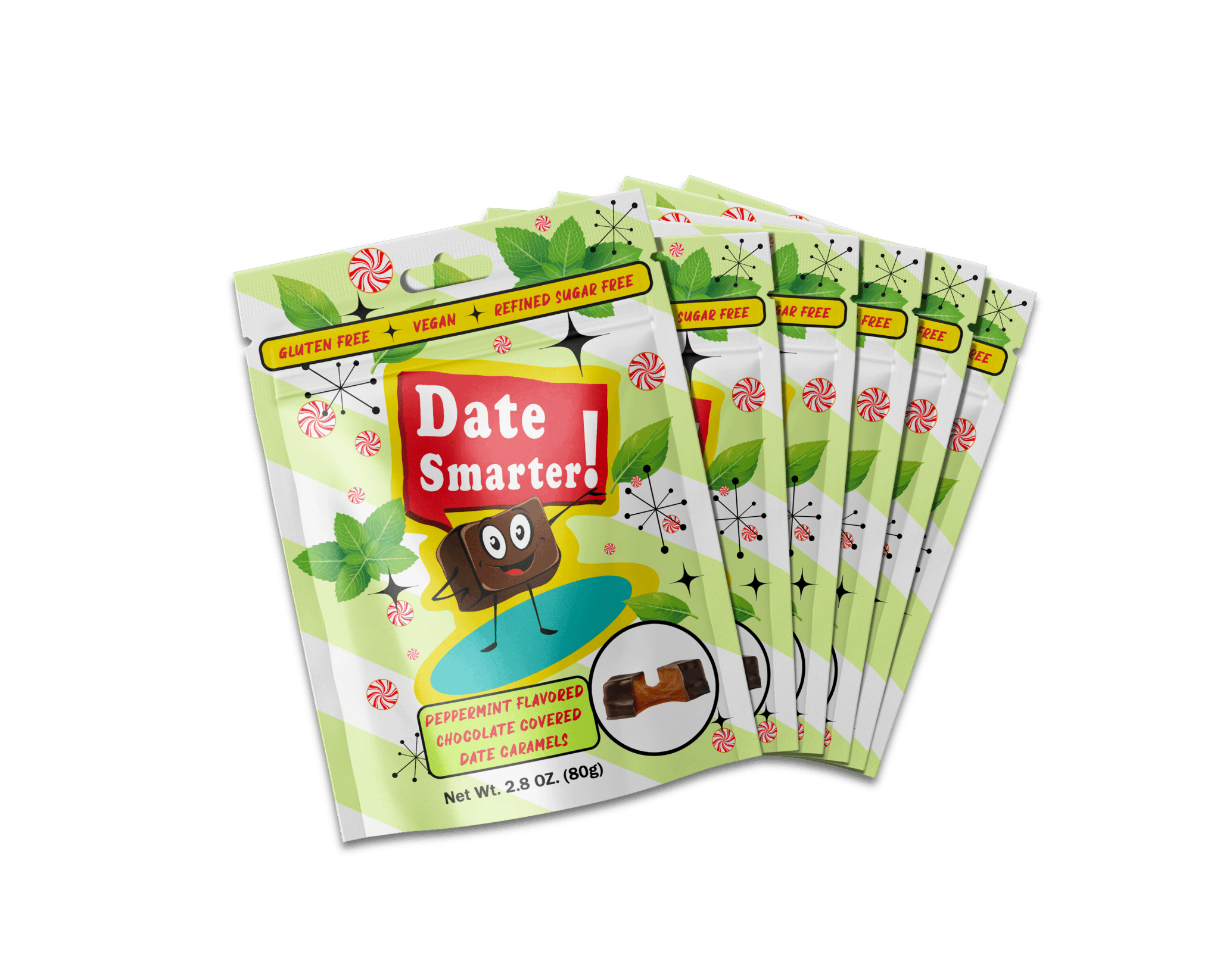 These peppermint chocolate covered date caramels have the caramel taste you know and love, sweetened naturally with dates. They are gluten free, refined sugar free, dairy free, chemical free, and vegan. Each Pouch Contains 3 servings of our Peppermint Chocolate Covered Date Caramels