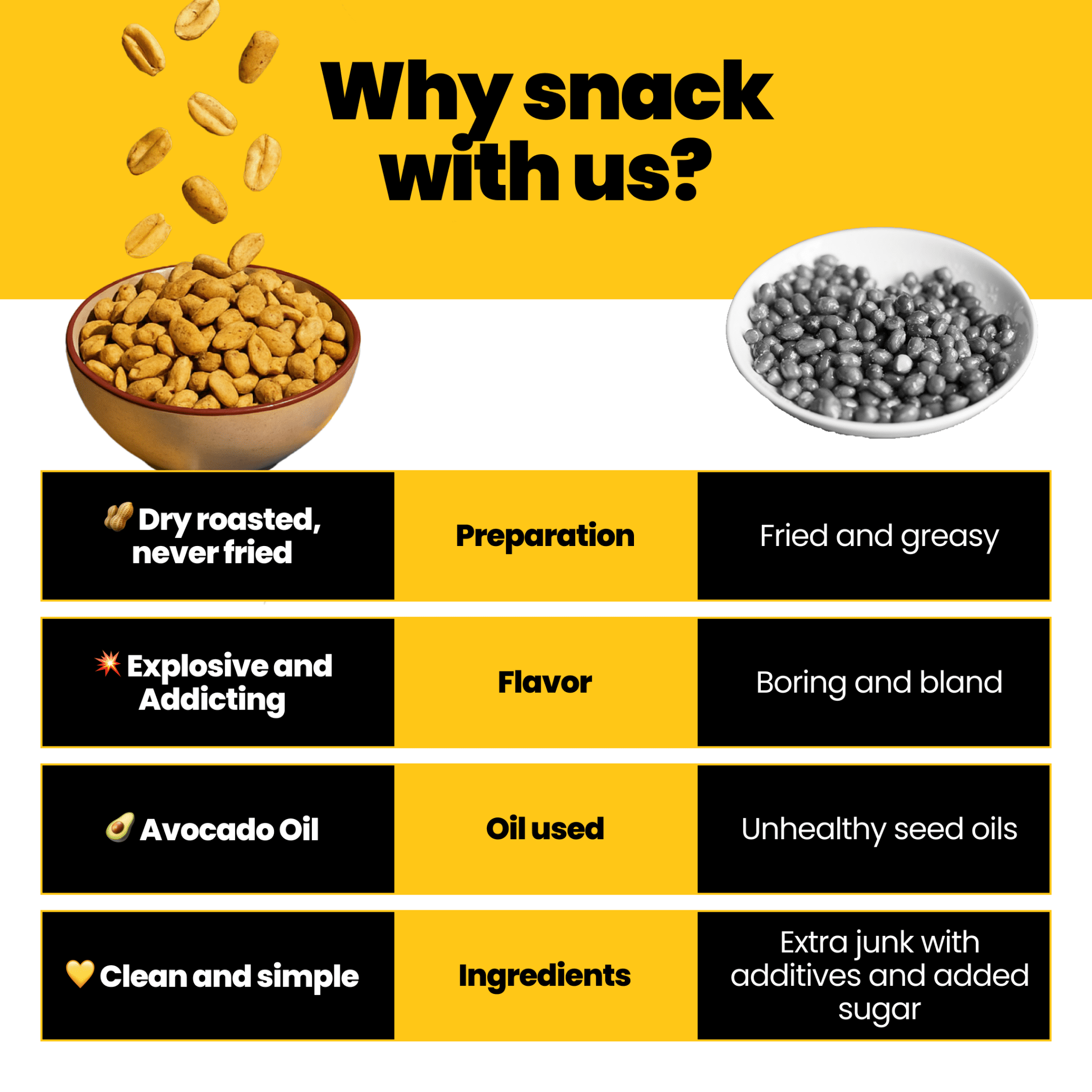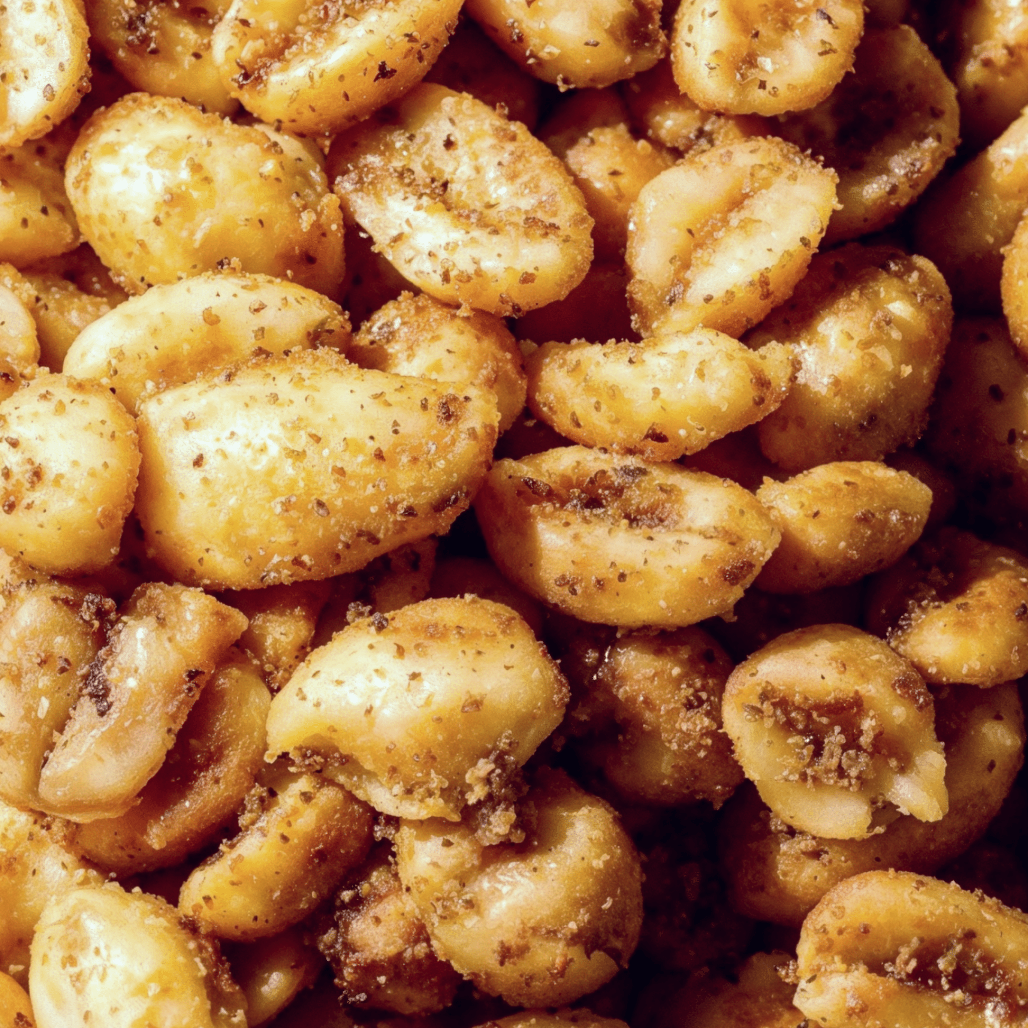 Crunchy, salty roasted peanuts made with avocado oil and clean ingredients—7g protein per serving for everyday snacking. Crunchy, salty, and deeply satisfying—these savory roasted peanuts are dry-roasted (never fried) and tossed in non-GMO avocado oil with a hint of black Himalayan salt, cumin, and citrusy dry mango powder.