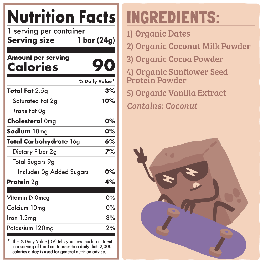 Organic Dates, Organic Coconut Cream, Organic Cocoa Powder, Organic Sunflower Seed Protein Powder, Organic Vanilla Extract. Contains: Coconut. sizes: 6/85oz. . Made with clean, simple ingredients. Always organic, gluten-free, and plant-based, and perfect for kids' lunchboxes and on-the-go snacking.
