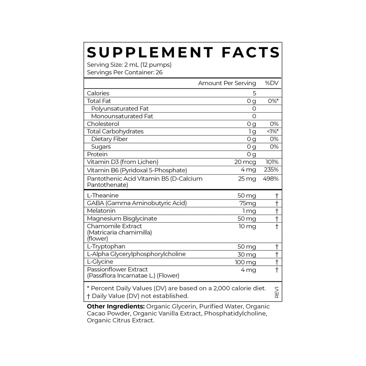 Vitamin D3 (from Lichen), Vitamin B5 (as D-Calcium Pantothenate), Vitamin B6 (as Pyridoxal 5-Phosphate), L-Theanine, Melatonin, GABA (Gamma Aminobutyric Acid), Magnesium Bisglycinate, Chamomile Extract (Matricaria Chaminimilla) (flower), L-Tryptophan, L-Alpha Glycerylphosphorycholine, L-Glycine, Passionflower Extract (Passiflora Incarnata L.) (flower)