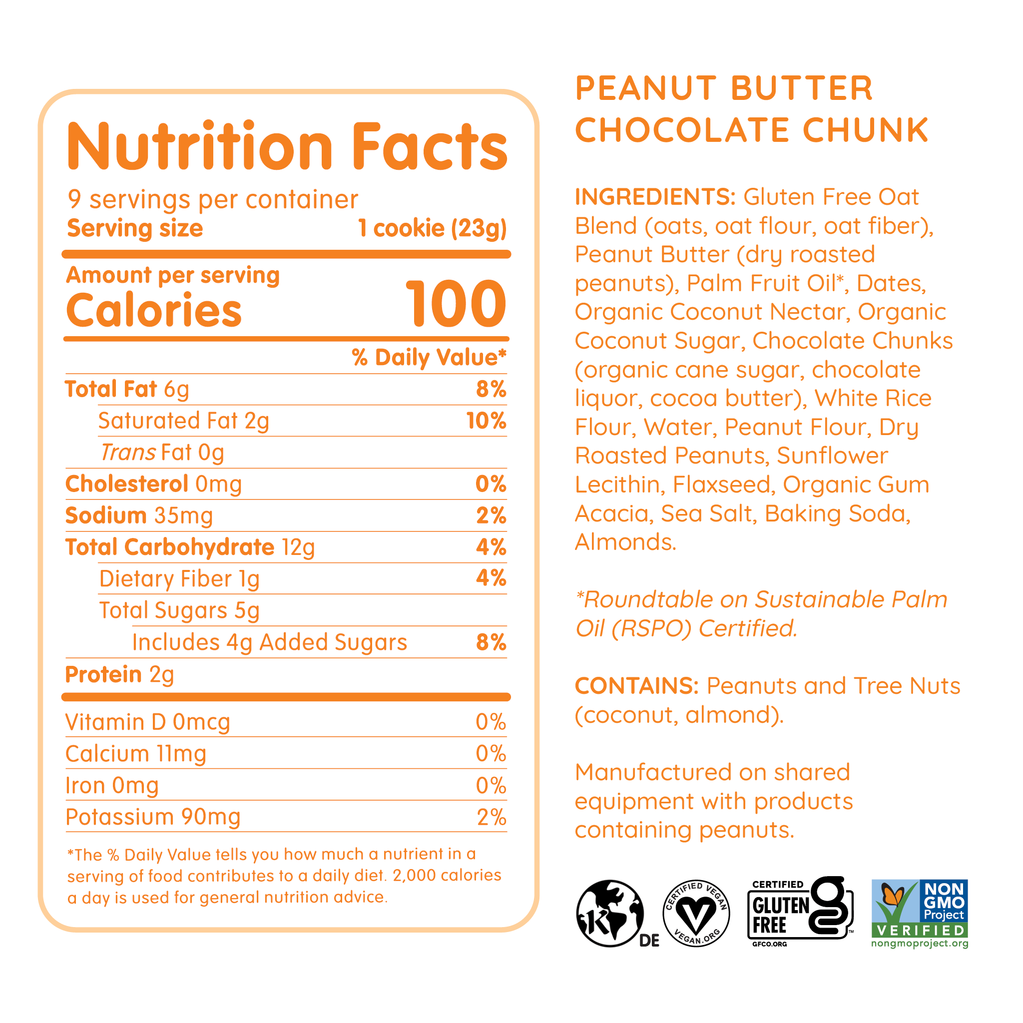 Gluten Free Oat Blend (oats, oat flour, oat fiber), Peanut Butter (dry roasted peanuts), Palm Fruit Oil*, Dates, Organic Coconut Nectar, Organic Coconut Sugar, Chocolate Chunks (organic cane sugar, chocolate liquor, cocoa butter), White Rice Flour, Water, Peanut Flour, Dry Roasted Peanuts, Sunflower Lecithin, Flaxseed, Organic Gum Acacia, Sea Salt, Baking Soda, Almonds. *Roundtable on Sustainable Palm Oil (RSPO) Certified.