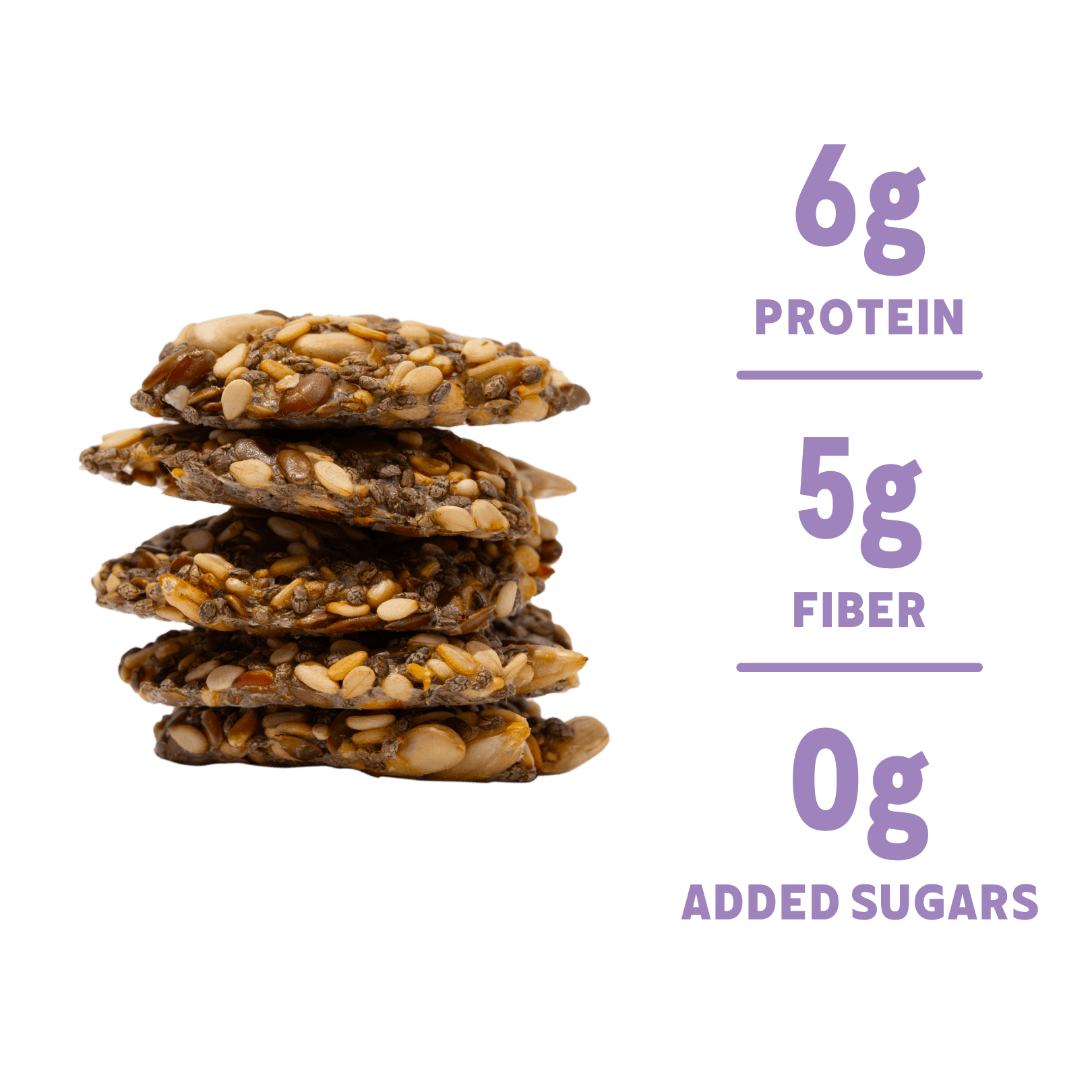 Sesame Minis: Sunflower Seeds, Flaxseeds, Chia Seeds, Sesame Seeds, less than 2% of: Pink Himalayan Salt, Black Pepper.