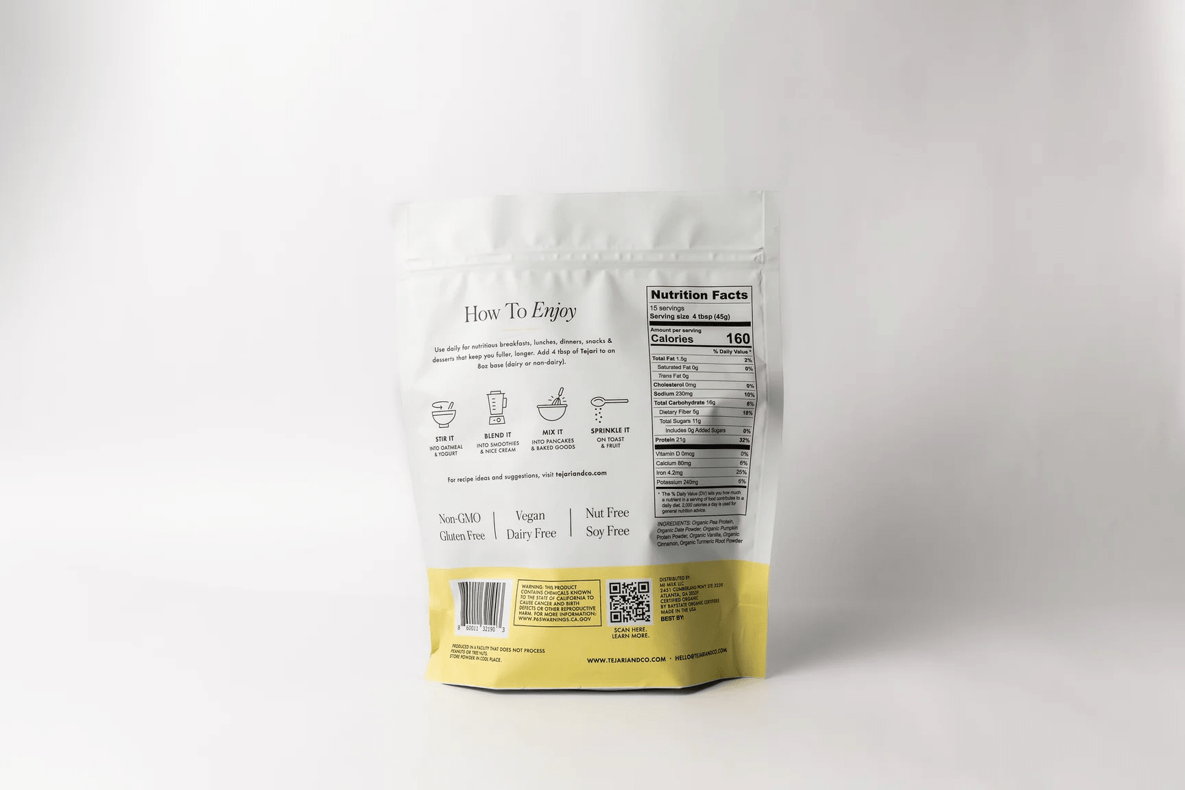 Use daily for nutritious breakfasts, lunches, dinners, snacks and desserts. Pro tip: Add four tablespoons of Tejari to an eight-ounce base (dairy or non-dairy).