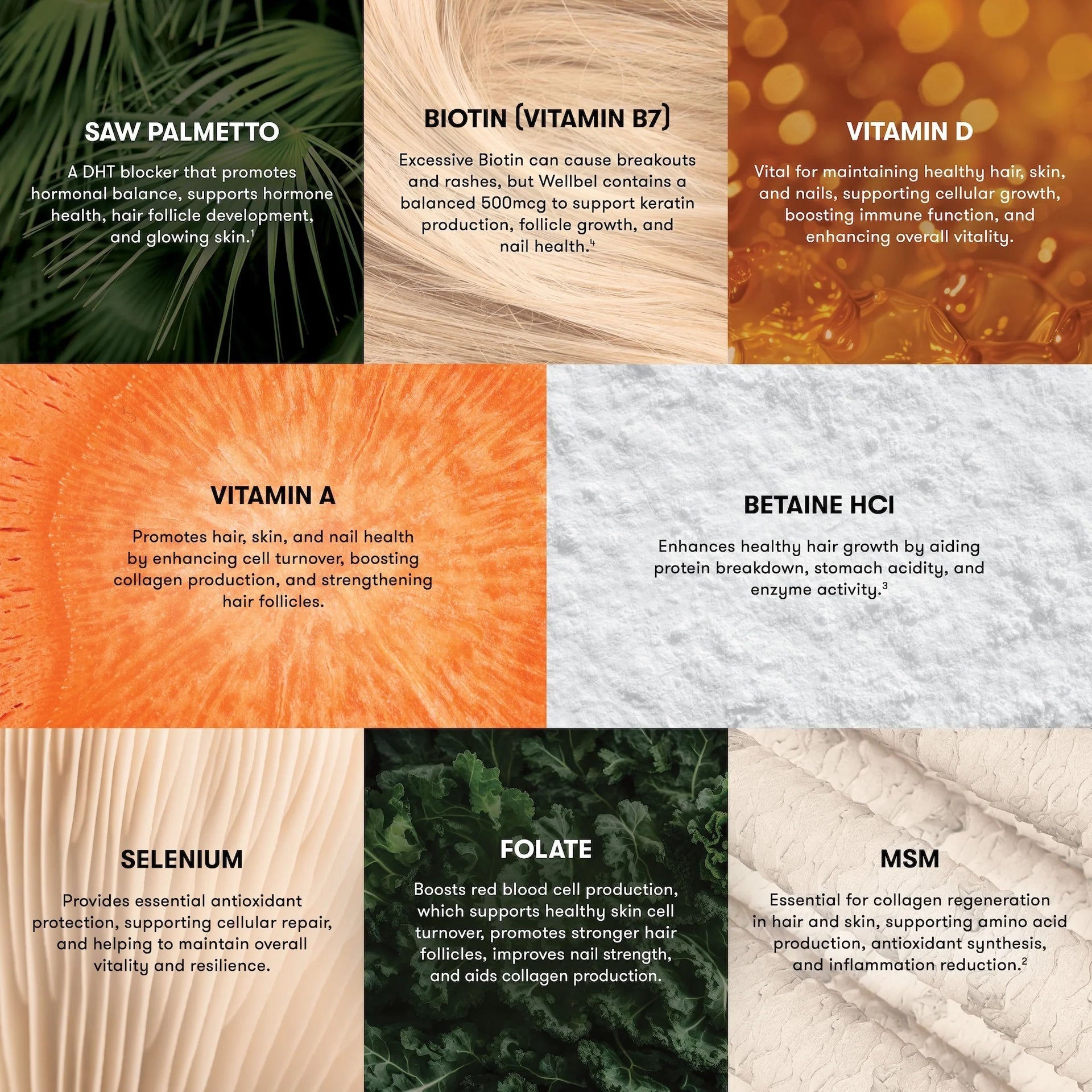 Wellbel Women hair supplement helps reduce shedding, improve thickness, and support visibly stronger, healthier hair. The formula nourishes follicles from within so you see better density, shine, fullness, and resilience over time. It also helps support internal balance, which directly influences how your hair looks and feels. Take 3 capsules daily to maintain steady growth, bounce, and long-term strength.